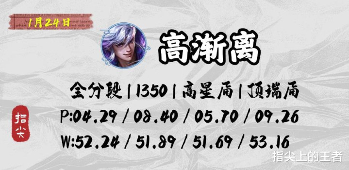 重点先聊聊高渐离,此前高渐离从T4晋级到了T3,但如今看来T3显然不适合他,所以我放到了T2上,如今顶端局中高渐离的数据相较于以前已经算是起飞了。