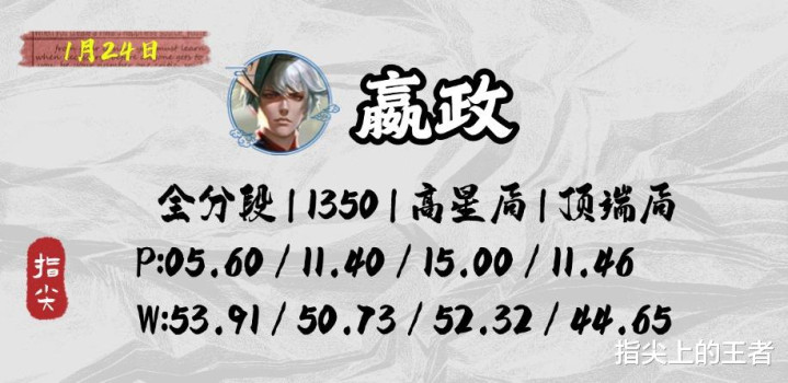 嬴政虽然削弱了,但终究还是蹭到了版本红利,凝冰之息的后期加强,全英雄的减速削弱下,嬴政的数据逐渐离谱,所以这一刀也算能理解,如今削弱后数据保持在了一个适中且偏上的位置,大招的数值依然是够用的,只是频率略微降低了一点。